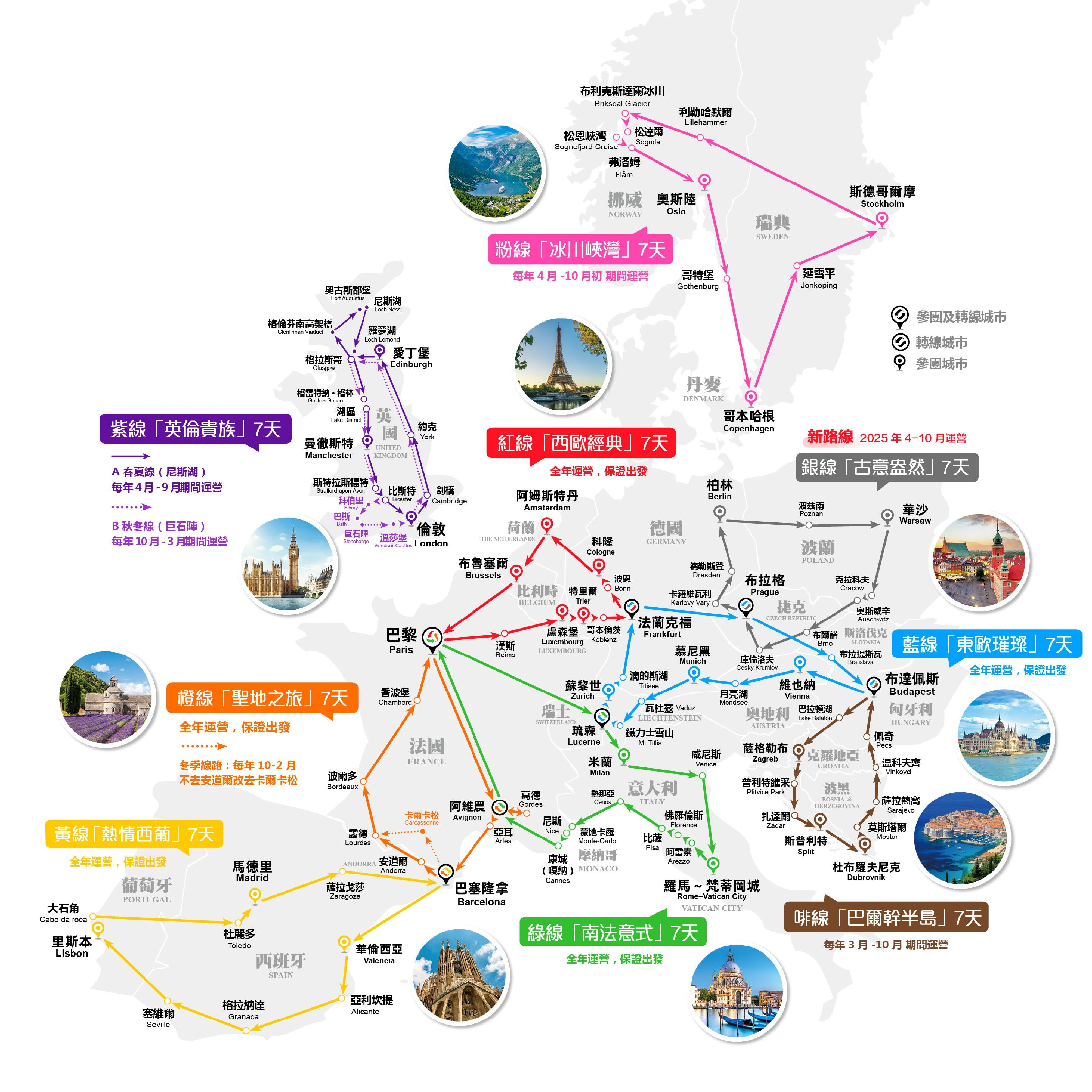 ※以下城市均设有固定“集合出发点”: 巴黎、伦敦、爱丁堡、曼彻斯特、阿姆斯特丹、布鲁塞尔、法兰克福、柏林、慕尼黑、科隆、特里尔、罗马、米兰、苏黎世、卢塞恩、布拉格、布达佩斯、维也纳、巴塞罗那、马德里、瓦伦西亚、里斯本、哥本哈根、斯德哥尔摩、奥斯陆、卢森堡、萨格勒布、斯普利特、杜布罗夫尼克、华沙。