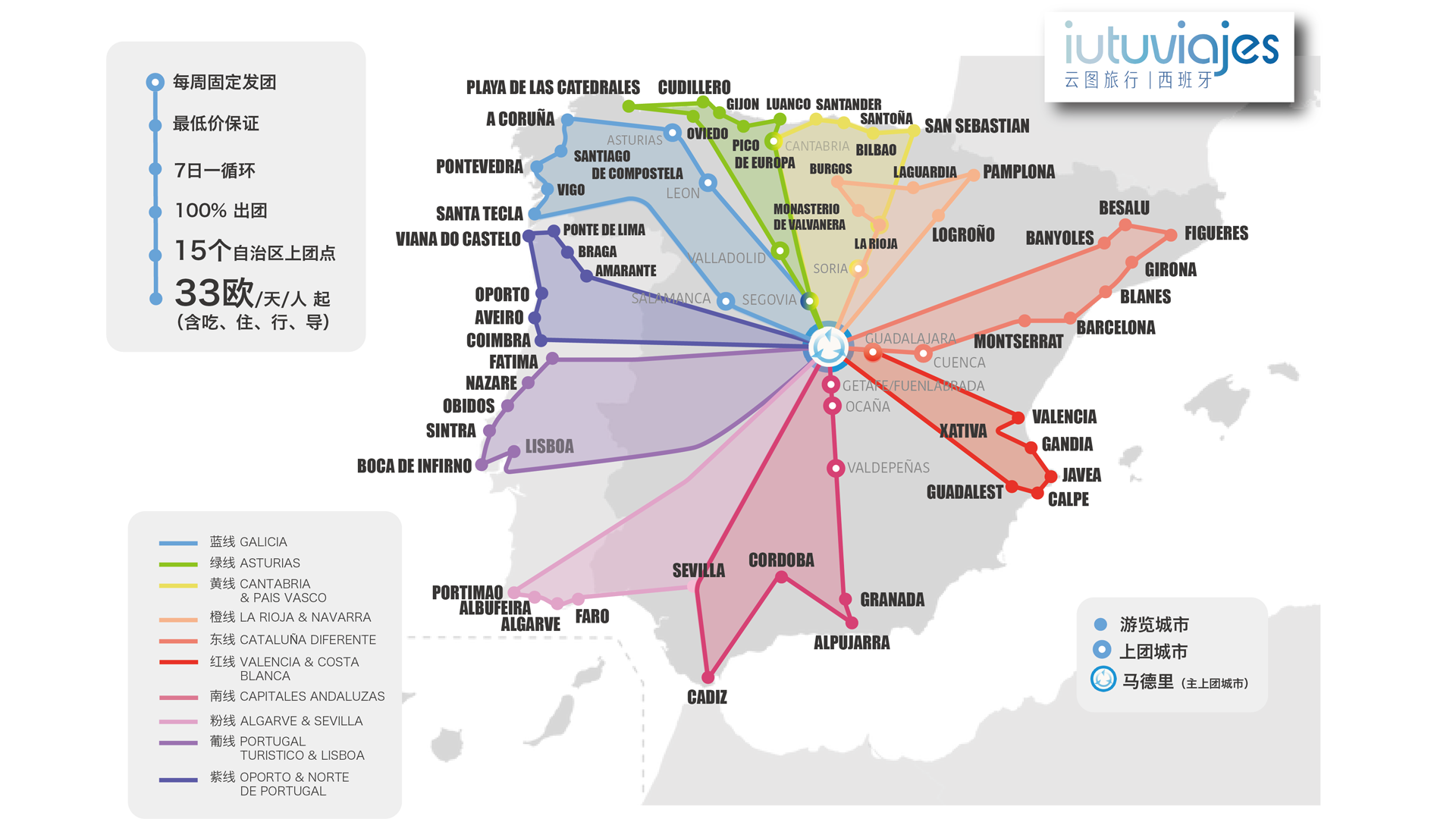 西班牙各地可上团出发,134个上团点