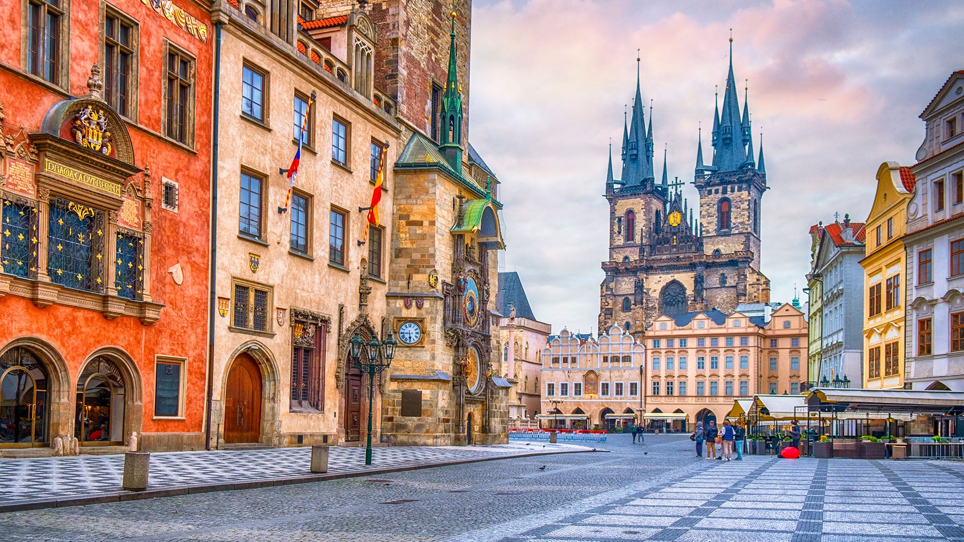 在老旧市政厅的南面墙上的天文钟,聚集着来自世界各地的游客驻足拍照,一同仰望这座已有六百多年历史的大钟。整个钟的造型十分精美,根据当年的地球中心说原理设计。上面的钟一天绕行一圈,下面的一年绕一周,每天中午12点,天文钟上,那十二尊精美的耶酥门徒像从钟旁依次现身,六个向左转,六个向右转,随着一声雄鸡的鸣叫,窗子关闭,报时钟声响起。